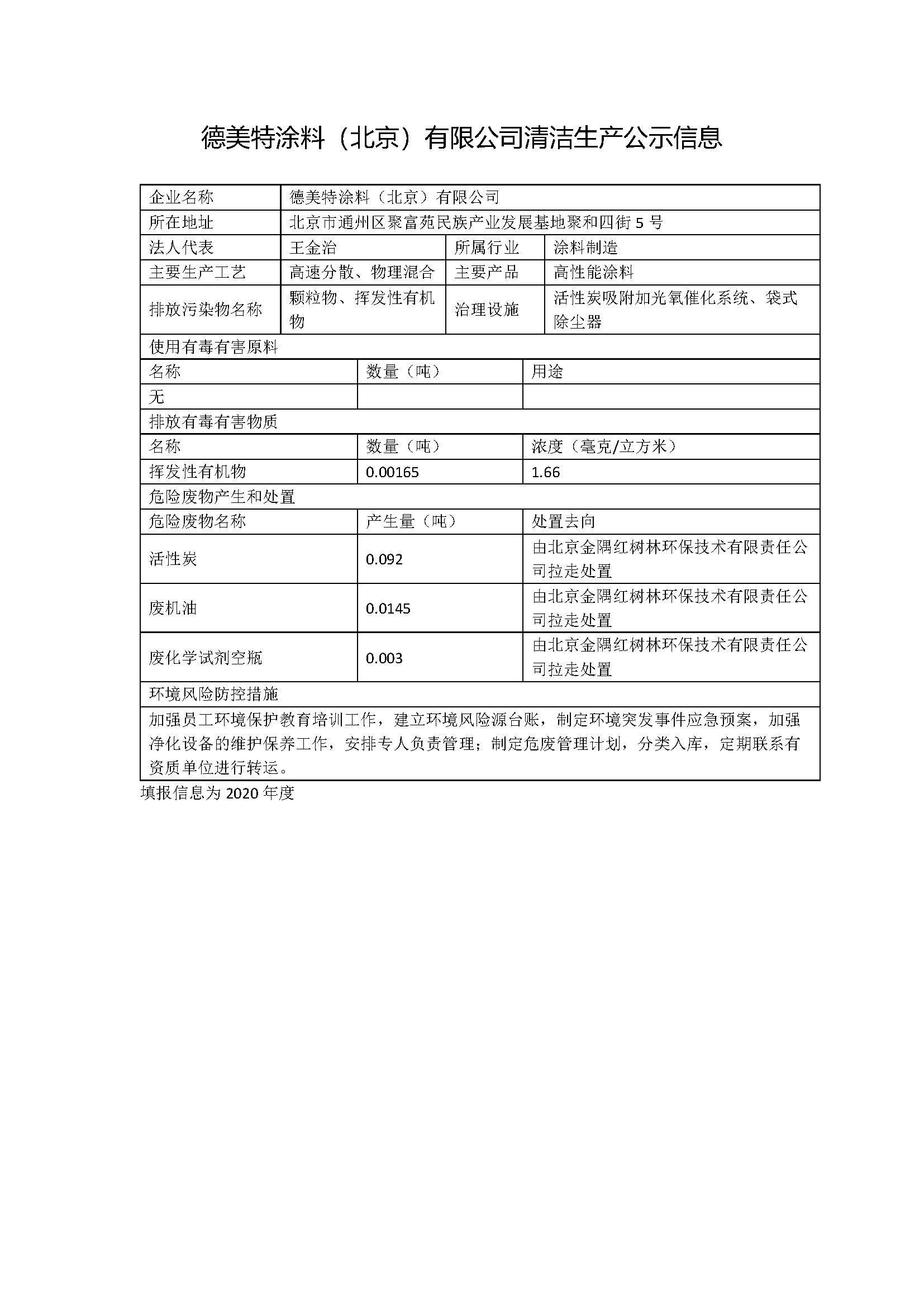 德美特涂料(北京)有限公司清潔生產公示信息